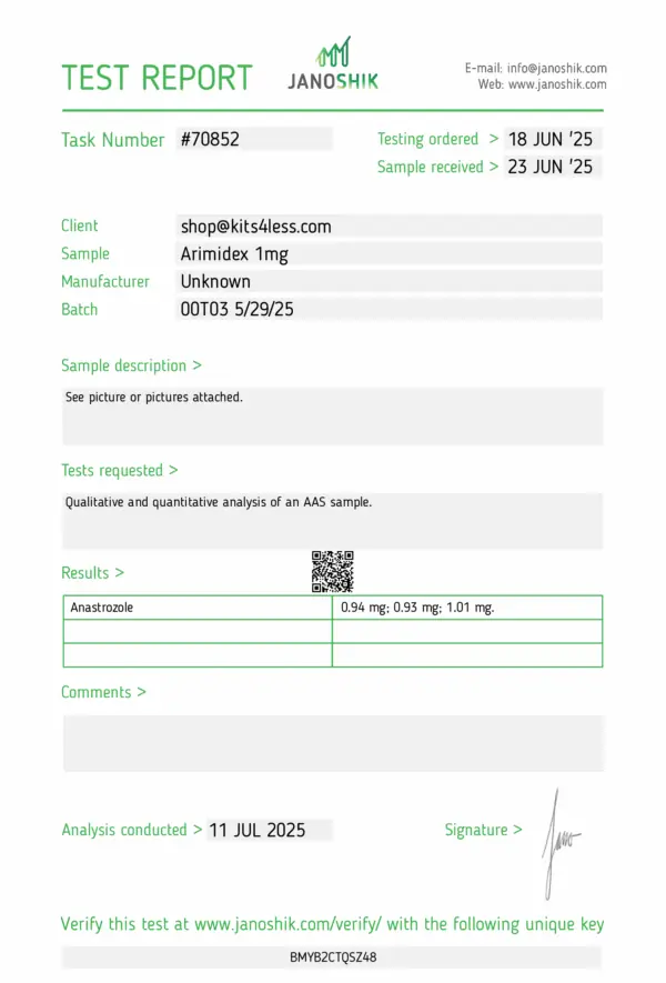 Arimidex (Anastrozole) is a powerful non-steroidal aromatase inhibitor (AI) used to control estrogen levels in men undergoing testosterone replacement therapy (TRT) or post-cycle recovery. By inhibiting the aromatase enzyme, Arimidex reduces the conversion of testosterone into estradiol, helping to prevent estrogen-related side effects such as water retention, gynecomastia, and mood fluctuations.