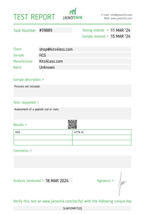 Each vial contains 5000 IU of lyophilized HCG powder, requiring reconstitution before use. 10 vials per kit.
